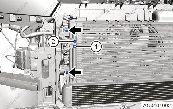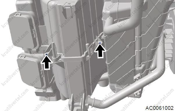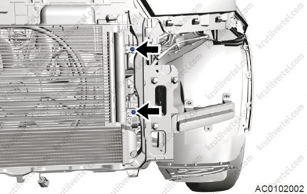 - Відкрутіть два болти (стрілки) між радіатором у зборі та конденсатором у зборі (ліворуч).