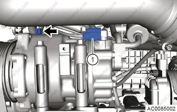 - Відкрутіть кріпильний болт (1) між лінією низького тиску кондиціонера та компресором у зборі, потім від'єднайте лінію низького тиску кондиціонера від компресора у зборі.