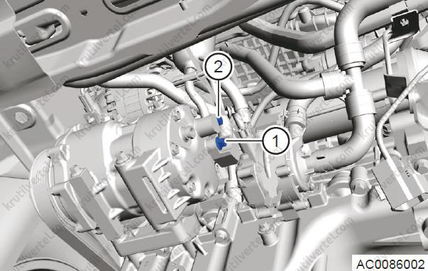 - Відкрутіть болт кріплення (2) між лінією високого тиску кондиціонера та компресором у зборі, потім від'єднайте лінію високого тиску кондиціонера від компресора у зборі.