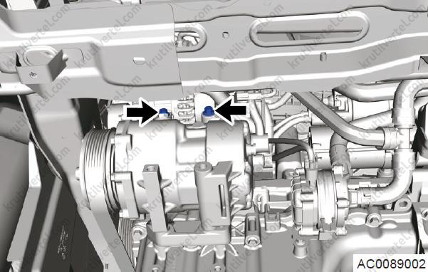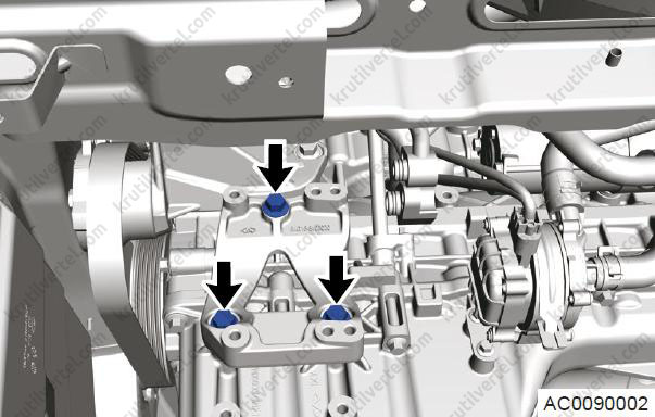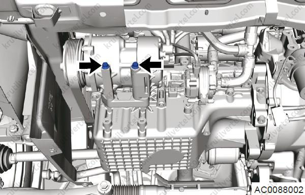 - Відкрутіть два болти (стрілки) між компресором у зборі та монтажним кронштейном.