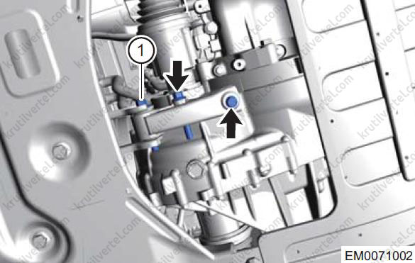- Поверніть два з'єднувальних болта (стрілки) та гайку для кріплення (1) між лівою монтажною подушкою в зборі та лівим монтажним кронштейном у зборі.