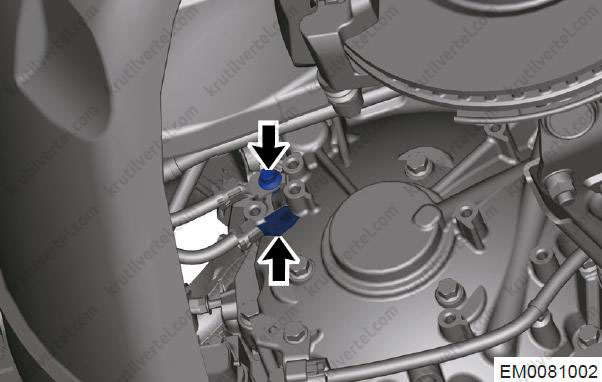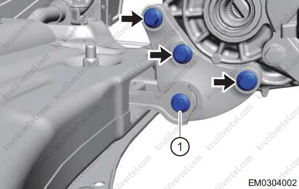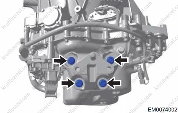 - Поверніть сполучні болти (стрілки) між верхньою частиною корпусу заднього кріплення та коробкою передач.