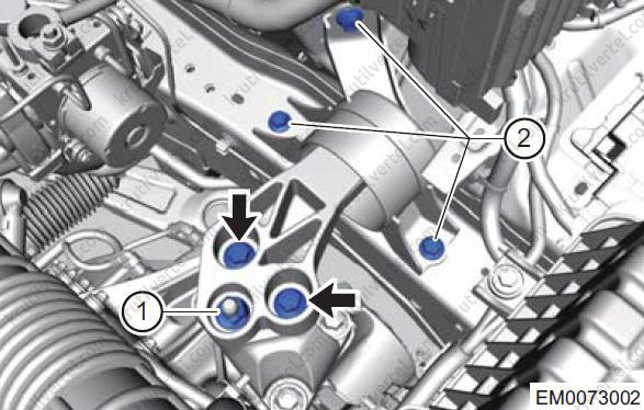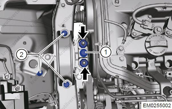 - Поверніть три з'єднувальних болта (2) між правою монтажною подушкою та кузовом.