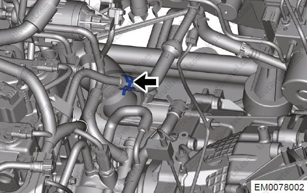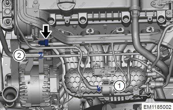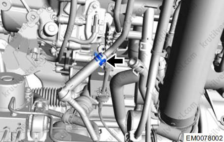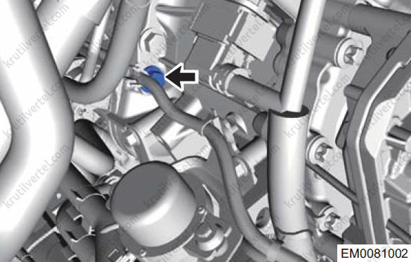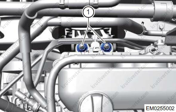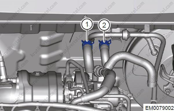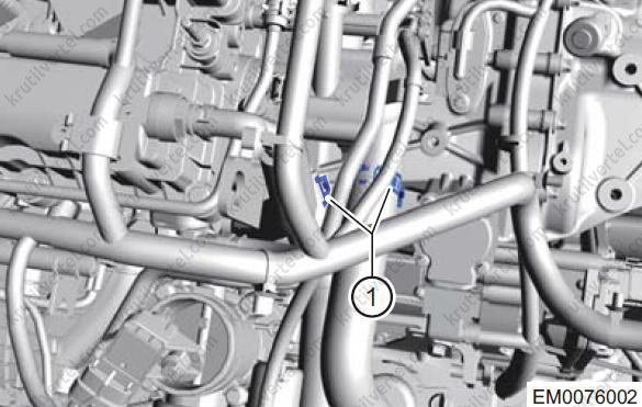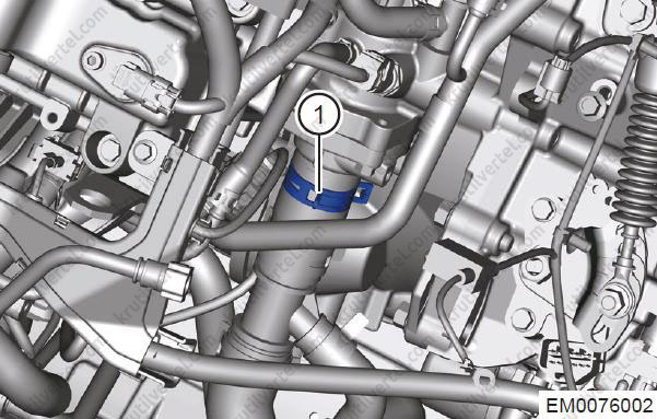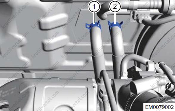 Послабте еластичні хомути (1) та від'єднайте з'єднання між впускним та випускним шлангами двигуна та гніздом термостата.