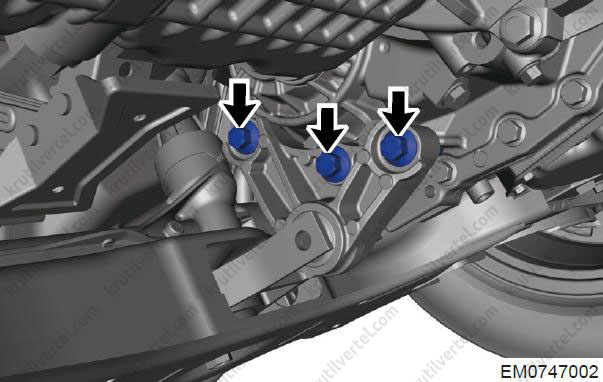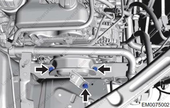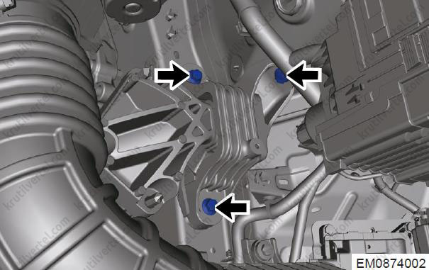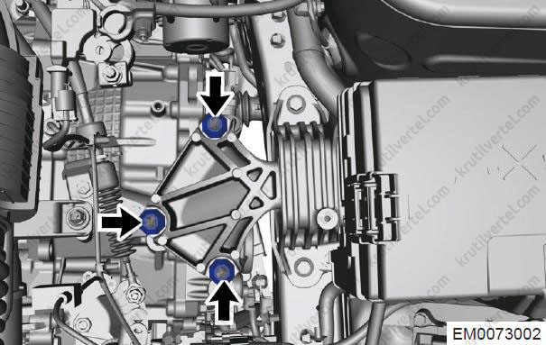 - Відкрутіть три сполучні болти (стрілки) між правою монтажною подушкою в зборі та кузовом.