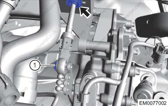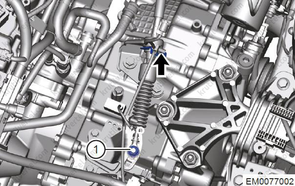 - Послабте гайку кріплення (1), одночасно від'єднайте з'єднання (стрілка) між тросом перемикання передач і зовнішнім важелем перемикання передач.