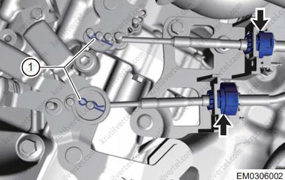 - Зніміть шплінти (1) і від'єднайте троси вибору та перемикання передач від важелів коробки.