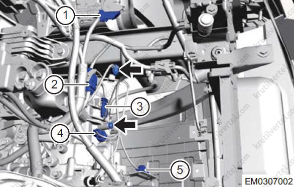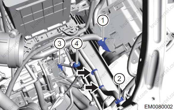 - Від'єднайте хомути кріплення джгута дротів двигуна (стрілки).