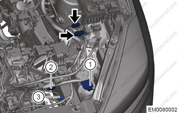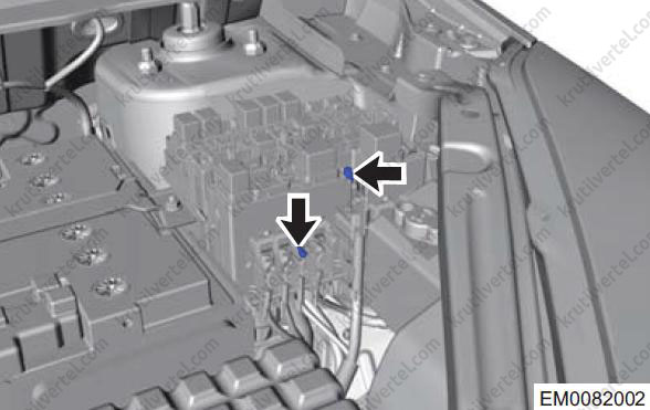 - Від'єднайте роз'єми (стрілки) між джгутом проводів двигуна та блоком запобіжників та реле моторного відсіку.