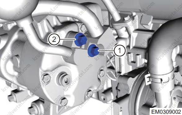 Відкрутіть кріпильні болти (1 і 2) між трубопроводами високого та низького тиску компресора кондиціонера.