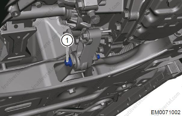 - Послабте затягування стопорного штифта (1) та від'єднайте трос вибору та перемикання передач від важеля коробки.