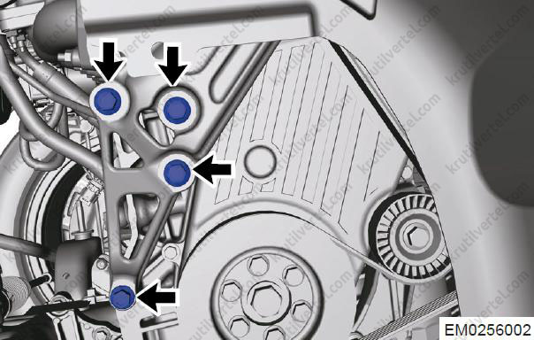 - Відкрутіть чотири кріпильні болти (стрілки) з кронштейна правої монтажної подушки двигуна.