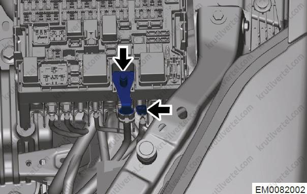 - Відкрутіть кріпильну гайку (стрілка) між блоком запобіжників та реле моторного відсіку, а також джгутом проводів акумуляторної батареї та від'єднайте їх.