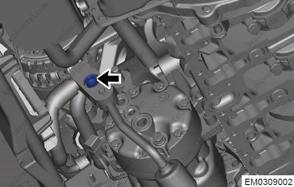 Поверніть стяжний болт (стрілка) між трубопроводом кондиціонера та компресором у зборі.
