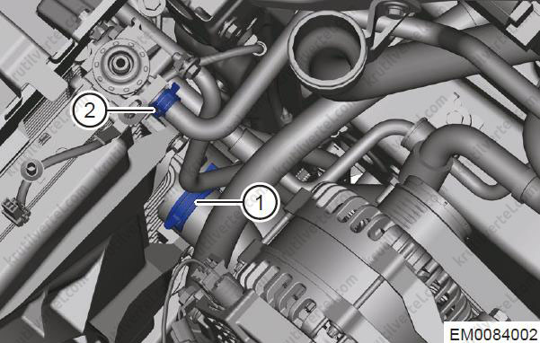 - Послабте еластичний хомут (1) та від'єднайте впускний шланг двигуна та радіатор.