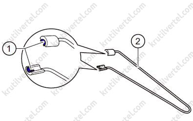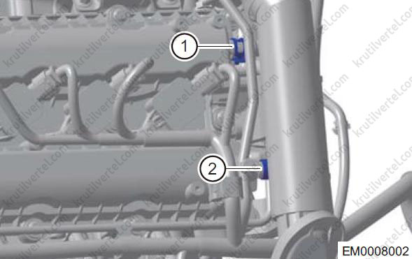 - Послабте пружинний хомут (2) та еластичний хомут (1), від'єднайте шланг вентиляції від кришки головки блоку циліндрів.