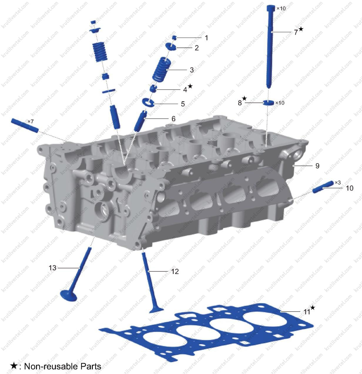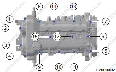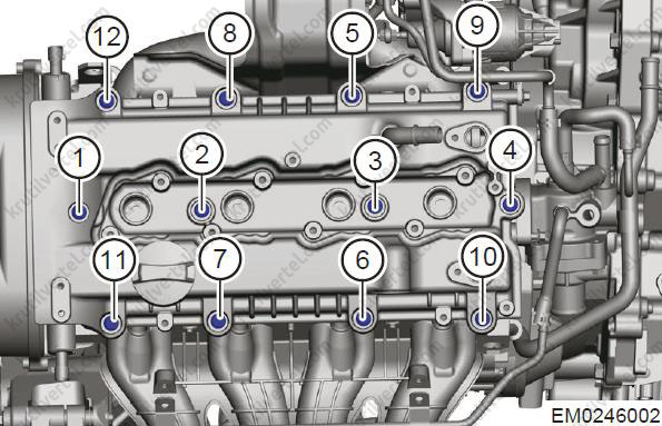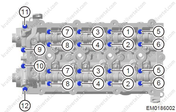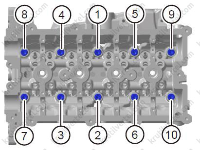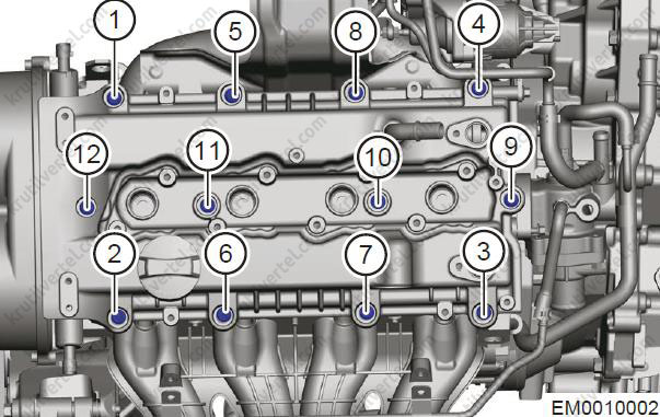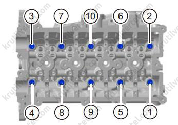 - Відкрутіть 12 кріпильних болтів кришки головки блоку циліндрів у порядку, вказаному на малюнку.