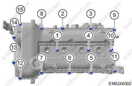 - Затягніть 15 болтів кріплення кришки головки блоку циліндрів у порядку, вказаному на малюнку. Момент затягування: