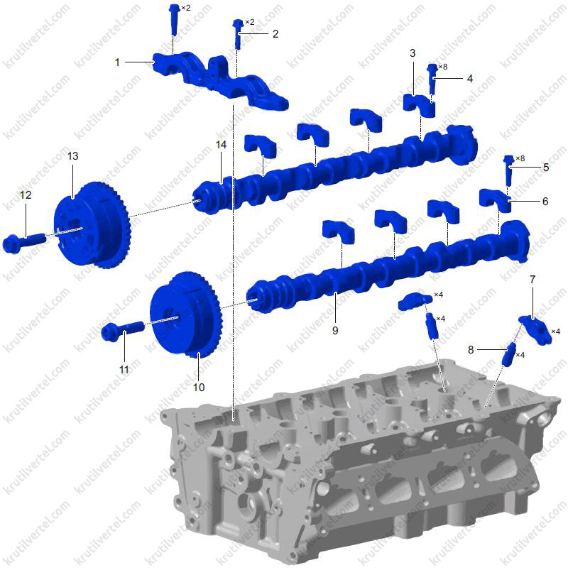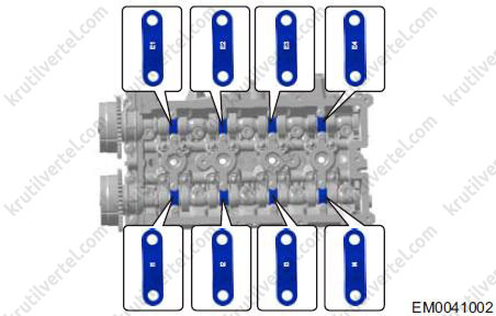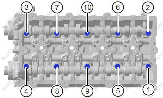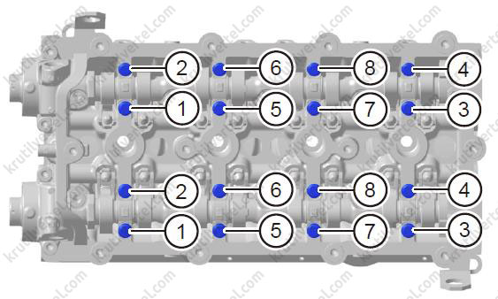 - Відкрутіть кріпильні болти кришок підшипників розподільних валів впускних та випускних клапанів у порядку, показаному на малюнку.