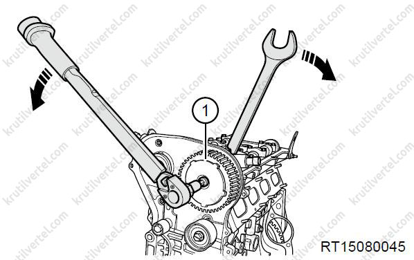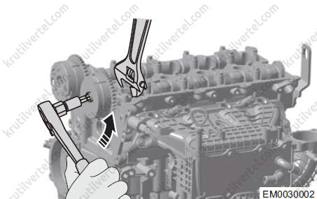 - Як показано на малюнку, використовуйте підходящий ключ для утримання розподільного валу впускних клапанів і зніміть кріпильний болт із впускного фазообертача у зборі в напрямку, вказаному стрілкою.