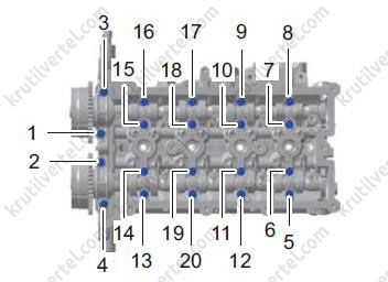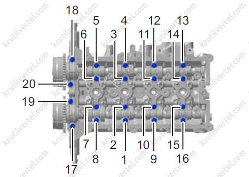 - Відкрутіть кріпильні болти кришки підшипника розподільних валів впускних та випускних клапанів у порядку, показаному на малюнку.