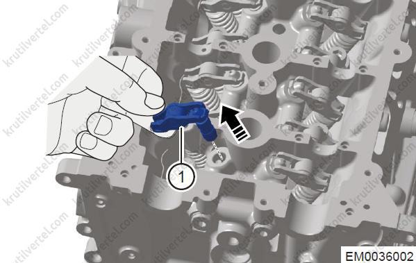 - Зніміть коромисло та гідравлічний штовхач клапана (1) у напрямку, вказаному стрілкою.