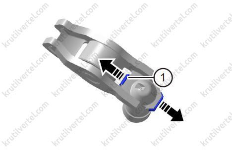 - Зніміть еластичний затискач (1) і відокремте коромисло та гідравлічний штовхач клапана у напрямку стрілки, як показано на малюнку.