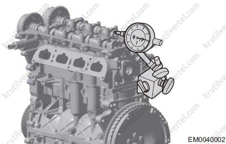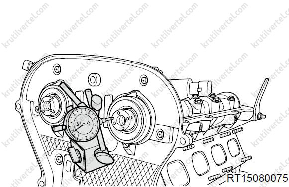 - Утримуючи плунжер циферблатного індикатора в контакті з переднім кінцем розподільчого валу, скиньте циферблат індикатора на нуль.