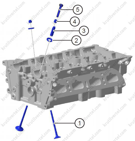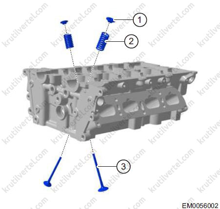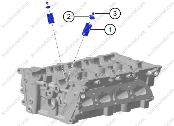 6. Зніміть верхнє сідло пружини клапана (1), пружину клапана (2) та впускний та випускний клапани (3) з головки блоку циліндрів.