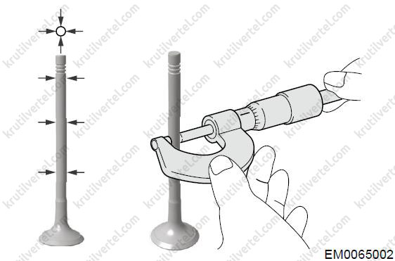 Виміряйте діаметр шийки розподільчого валу за допомогою мікрометра. Якщо діаметр шийки розподільчого валу не в межах вказаного діапазону, замініть розподільний вал впускних/випускних клапанів.