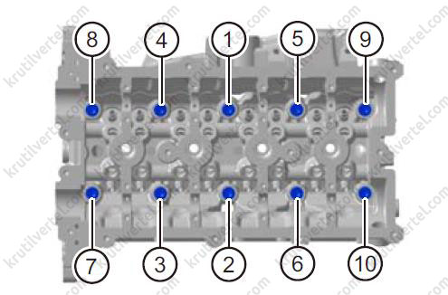 1. Затягніть болти кріплення головки блоку циліндрів у порядку від (1) до (10), показаному на малюнку: