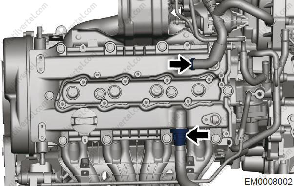 ![Ослабте пружинний хомут (2) і еластичний хомут (1), від'єднайте шланг вентиляції від кришки головки блоку циліндрів головка блоку циліндрів та її компоненти Chery Tiggo 8 з 2018 року, головка блоку циліндрів Чері Тігго 8 з 2018 року]()