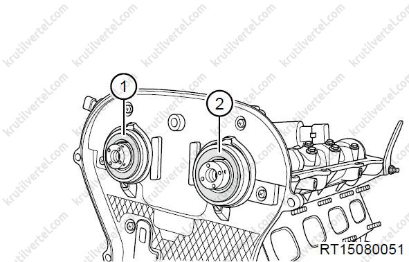 - Викруткою з плоским наконечником, обгорненою захисною стрічкою, витягніть сальник (1) розподільного валу випускних клапанів та сальник (2) розподільного валу впускних клапанів.