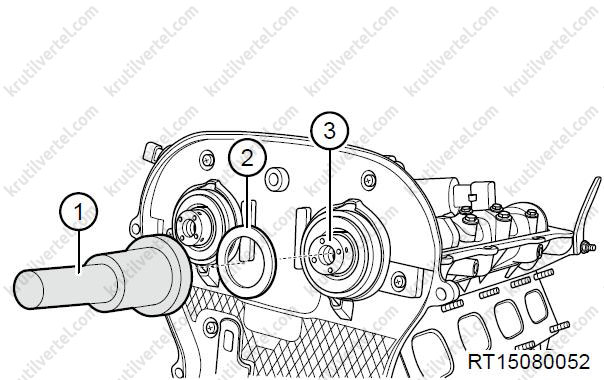 Використовуючи пристрій для встановлення сальника розподільного валу (1), встановіть сальник (2) на розподільчий вал (3).