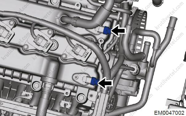 3. Відкрутіть два болти (стрілки) підйомних вушок двигуна.