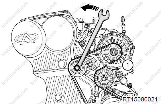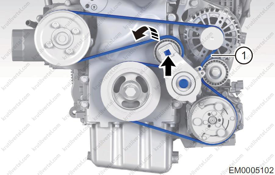 Вставте наконечник стрижня з храповим механізмом в отвір (стрілка) під палець натягувача і підніміть його вгору у напрямку стрілки, як показано на ілюстрації. Потім зніміть ремінь (1) приводу допоміжних агрегатів.