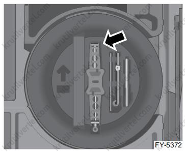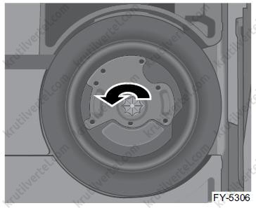 Запасне колесо зберігається під набором інструментів у багажнику. Відкрийте декоративну панель багажника, дістаньте набір інструментів та ослабте блокувальну рукоятку, щоб зняти запасне колесо.