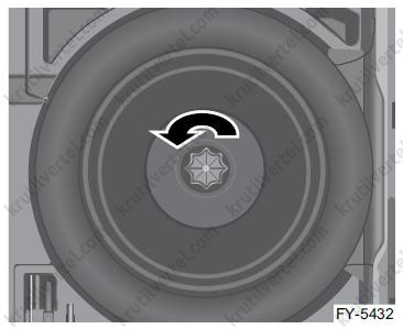Якщо автомобіль обладнаний сабвуфером, відкрийте декоративну панель багажника, від'єднайте роз'єм джгута проводів сабвуфера, поверніть сабвуфер проти годинникової стрілки, доки він не звільниться, і зніміть притискну пластину, щоб вийняти запасне колесо.