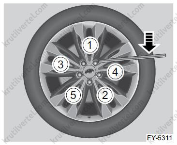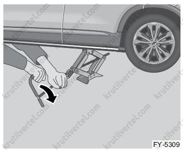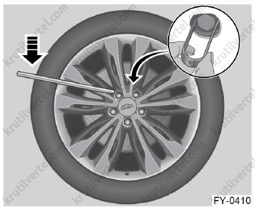3. Вийміть балонний ключ із набору інструментів та встановіть ключ на колісну гайку. Потім ключем відверніть усі колісні гайки проти годинникової стрілки приблизно на один оберт, але не відкручуйте їх повністю.