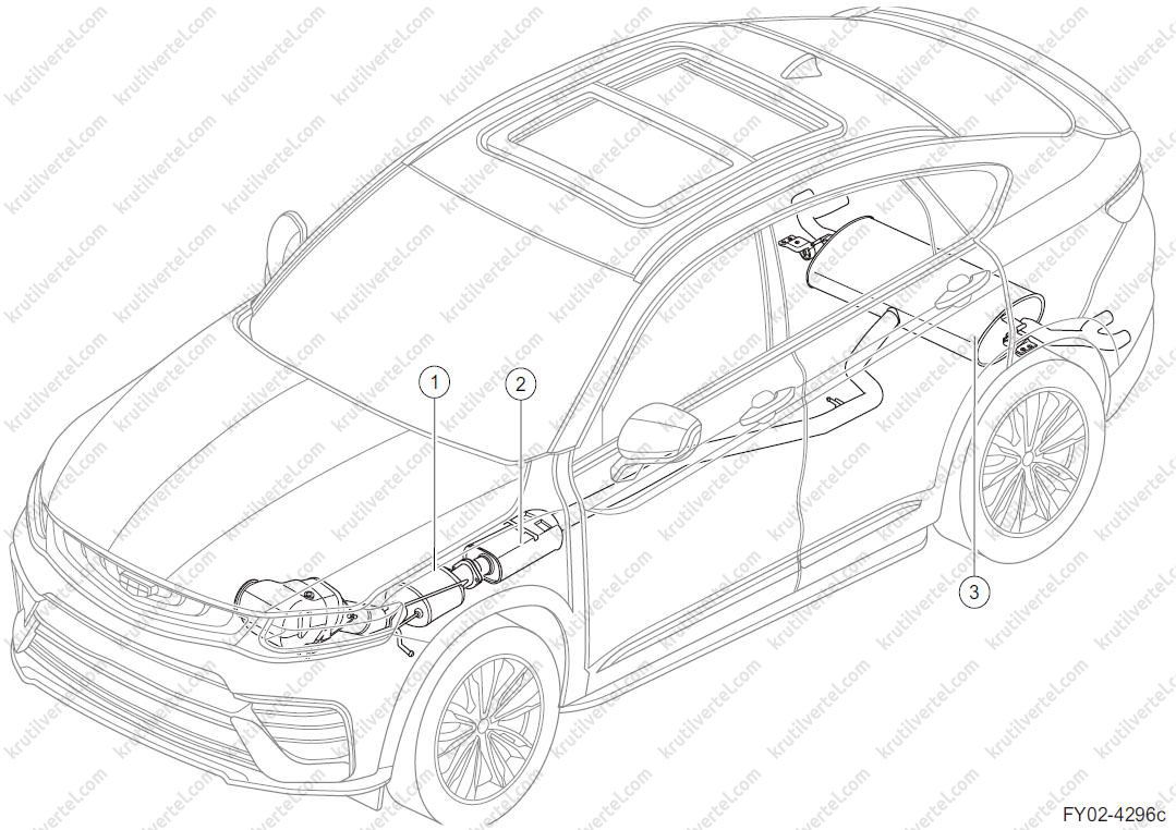 Трикомпонентний каталітичний нейтралізатор: Передній каталітичний нейтралізатор використовується для зниження вмісту токсичних речовин і вуглеводнів у відпрацьованих газах двигуна. Активний матеріал переднього каталітичного нейтралізатора містить платину, паладій та родій. Каталітичний нейтралізатор у процесі хімічної реакції перетворює шкідливі оксид вуглецю (СО) і вуглеводні (НС), що не згоріли, в нешкідливі двоокис вуглецю (СО2) і воду (Н2О). Також нейтралізатор знижує вміст оксидів азоту (NOx). На передньому каталітичному нейтралізаторі встановлені два кисневі датчики, які вимірюють вміст кисню у відпрацьованих газах на вході та виході нейтралізатора.