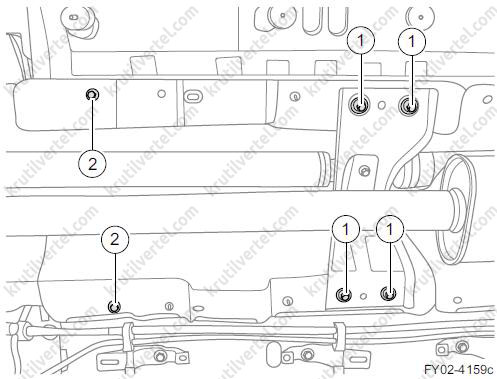 11. Відкрутіть дві гайки (2) кріплення заднього кронштейна до кронштейна роздавальної коробки.