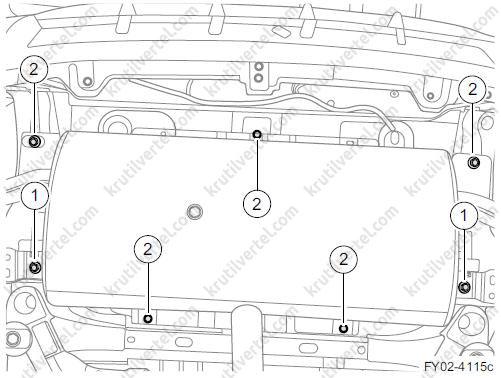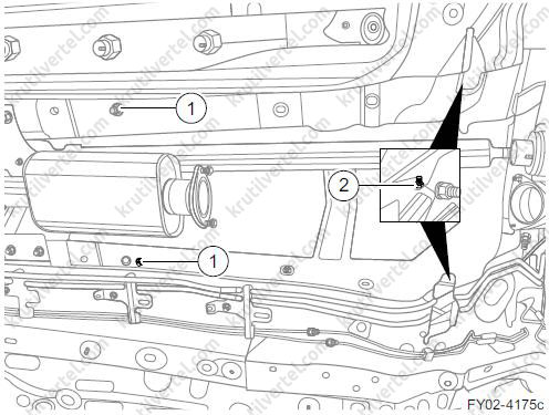 3. Відкрутіть по одній гайці (2) кріплення теплозахисного екрана переднього глушника до лівого та правого кронштейнів відповідно і зніміть теплозахисний екран.