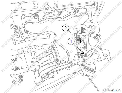 18. Викрутіть порожнистий болт (2), що з'єднує масляну трубку, що підводить, з турбокомпресором.