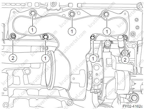 5. Закрутіть порожнистий болт (2), що з'єднує масляну трубку, що підводить, з турбокомпресором. Момент затягування: 10 Н·м.