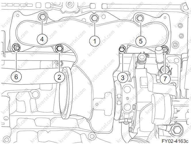 4. Закрутіть болт (1), що з'єднує трубку рідини, що охолоджує, з турбокомпресором. Момент затягування: 26 Н·м.