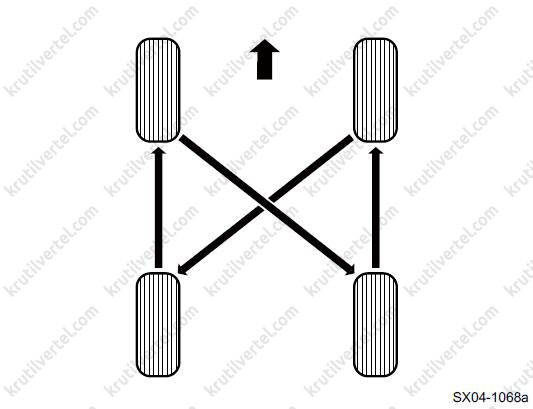 1. Перестановку коліс рекомендується виконувати одночасно з перевіркою гальмівних механізмів відповідно до графіка технічного обслуговування, наведеного в Посібнику з експлуатації автомобіля, або у випадку, якщо різниця між глибиною протектора шин на передніх та задніх колесах перевищує 1,5 мм.