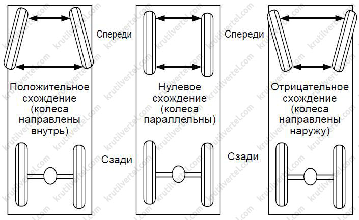 Для збереження коліс у перпендикулярному щодо дороги положенні для прямолінійного руху з мінімальним зносом протектора та забезпечення тягового зусилля при торканні автомобіля розроблено безліч пристроїв підвіски та кермових механізмів.