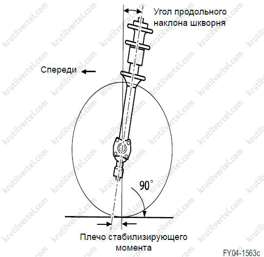 Кут поздовжнього нахилу шворня показує, як вісь повороту колеса нахилена вперед або назад. Кут поздовжнього нахилу шкворня – це кут між віссю повороту колеса та вертикальною лінією, якщо дивитися збоку. Кут поздовжнього нахилу шворня вважається позитивним, якщо вісь повороту колеса нахилена назад і негативним - якщо вперед. Відстань між точкою перетину осі повороту колеса з поверхнею дороги та центральною точкою плями контакту колеса з дорогою називається усуненням осі повороту. Кут поздовжнього нахилу шкворня дозволяє покращити стійкість під час руху по прямій лінії: якщо кут поздовжнього нахилу шворня позитивний, при повороті наліво ліва цапфа відхилятиметься вниз. (Це пояснюється обертанням цапфи щодо нахиленої осі повороту.) Але оскільки цапфа закріплена на колесі, а земля не дає їй опускатися нижче, то рух цапфи замість цього викличе переміщення лівого поворотного кулака вгору. Таким чином, кузов автомобіля злегка піднімається, а після завершення повороту, коли водій відпускає кермо, поворотний кулак переміщається вниз під вагою піднятого кузова. При цьому цапфа повертається у вихідне положення.