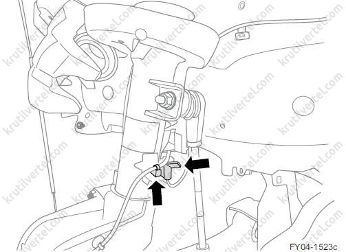 7. Зніміть два кріпильні затискачі джгута проводів датчика швидкості переднього колеса та від'єднайте джгут дротів від передньої стійки.