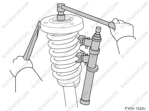 3. Зніміть пилозахисний чохол верхньої опори переднього амортизатора, за допомогою спеціального інструменту зафіксуйте сідло пружини та відверніть стопорну гайку.